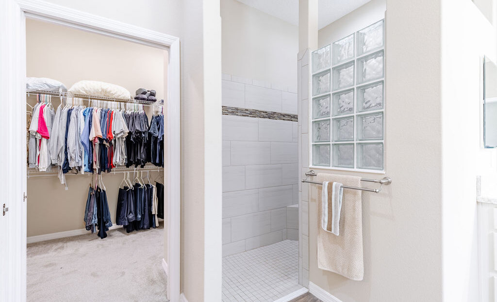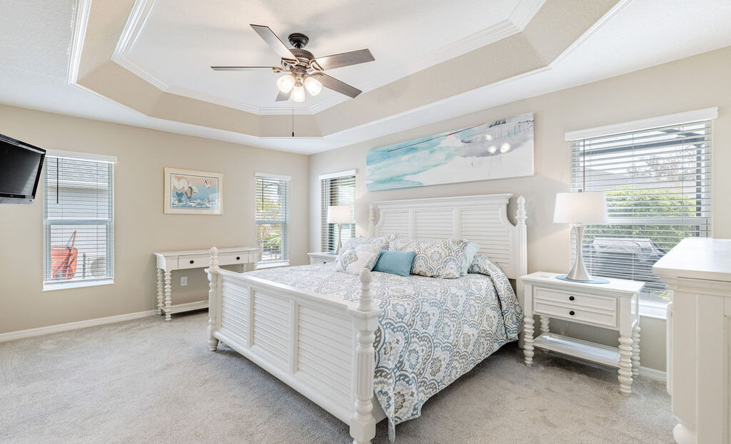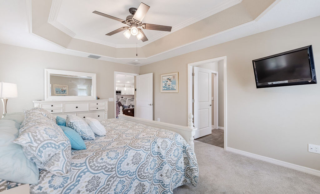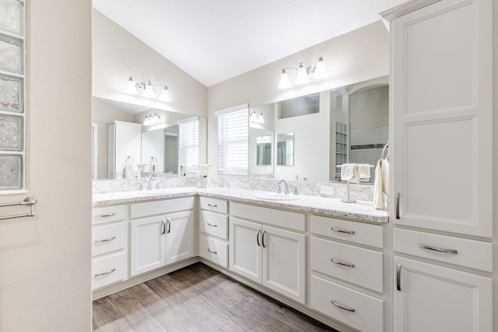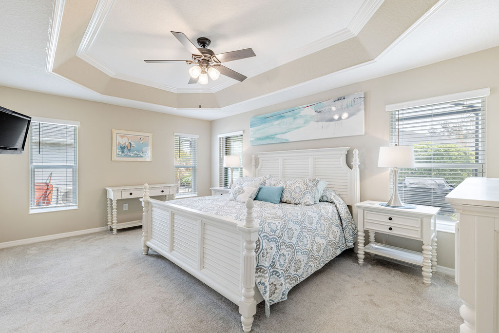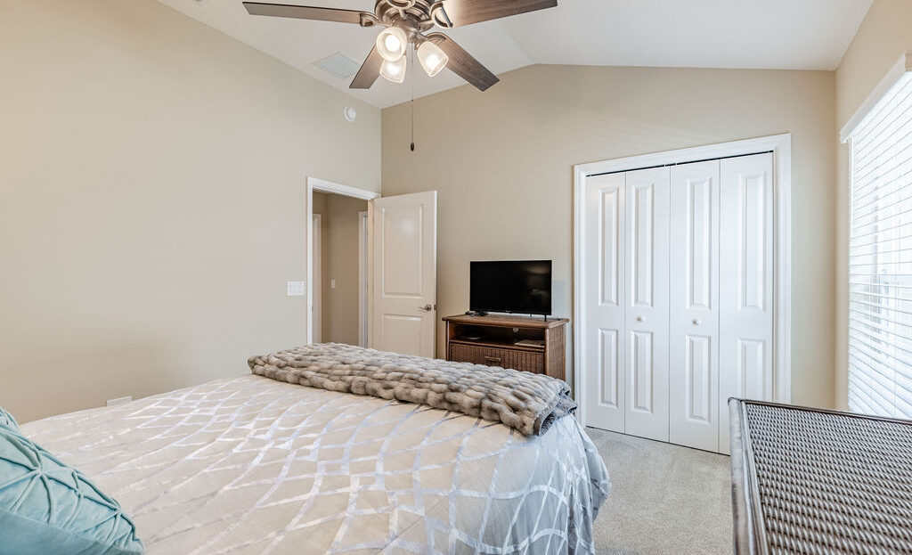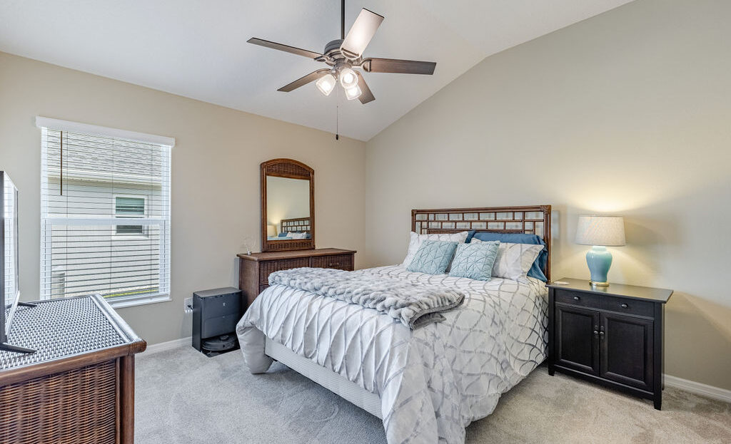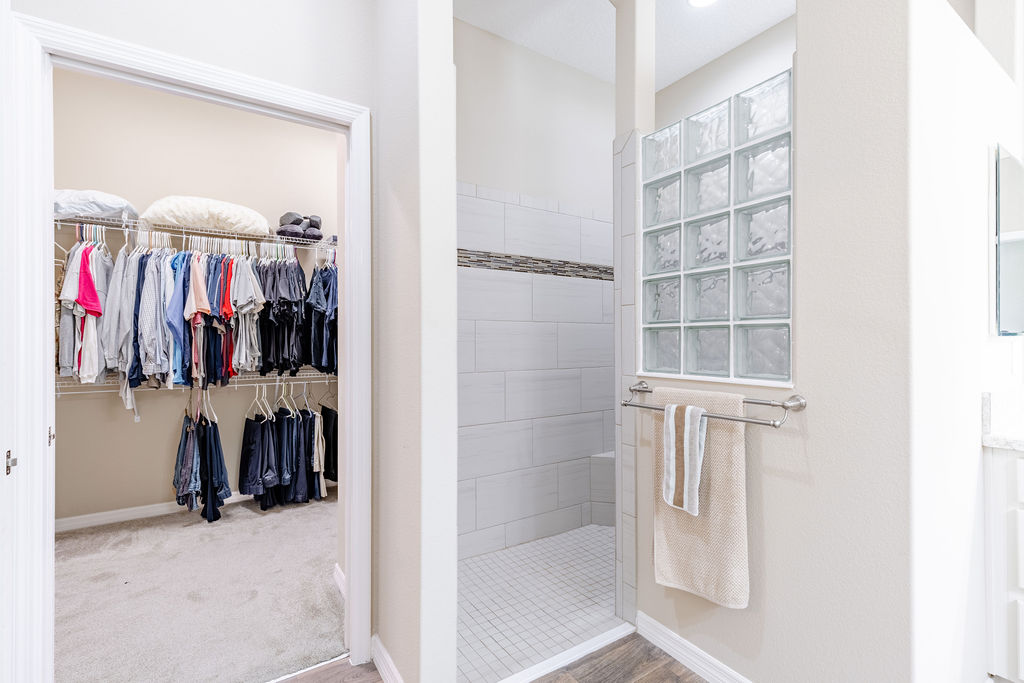 Inside, you’ll find soaring ceilings, natural light, and an open layout that feels comfortable from the moment you walk in. The kitchen is a standout, featuring quartz countertops, upgraded stainless steel appliances, abundant cabinetry, a large island, and custom touches that make the space both functional and inviting. The primary suite offers a spacious retreat with a walk-in closet, dual sinks, linen storage, and a walk-in shower, while the split-bedroom layout gives guests added privacy.